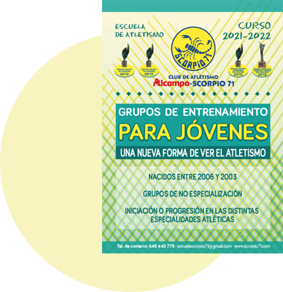 Los grupos de entrenamiento para jóvenes de la escuela de atletismo de ALCAMPO-Scorpio71 van dirigidos a atletas nacidos entre 2010 y 2007 que no quieran especializarse en una prueba determinada, jóvenes que se quieran iniciar en las diferentes especialidades atléticas o atletas que ya conocen todas las especialidades, pero no tienen un afán competitivo.